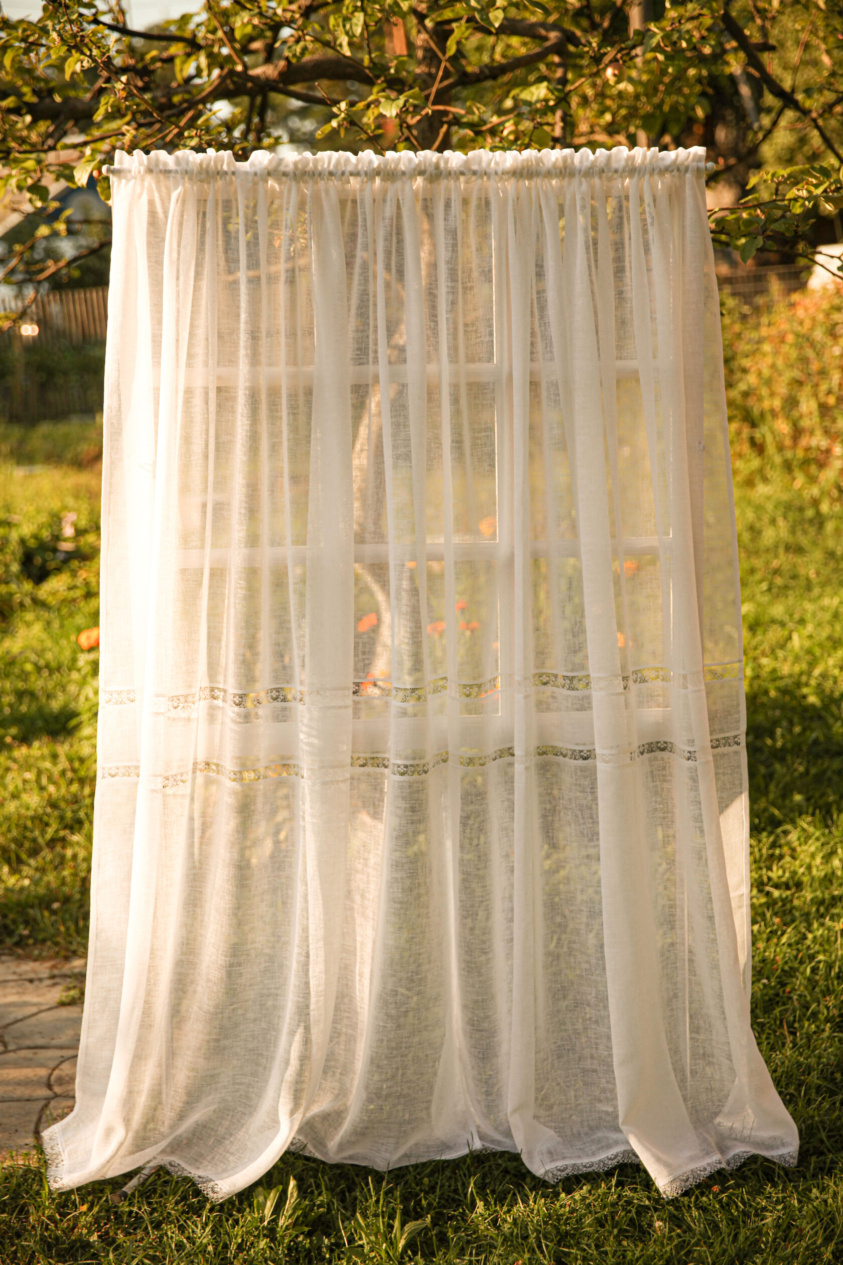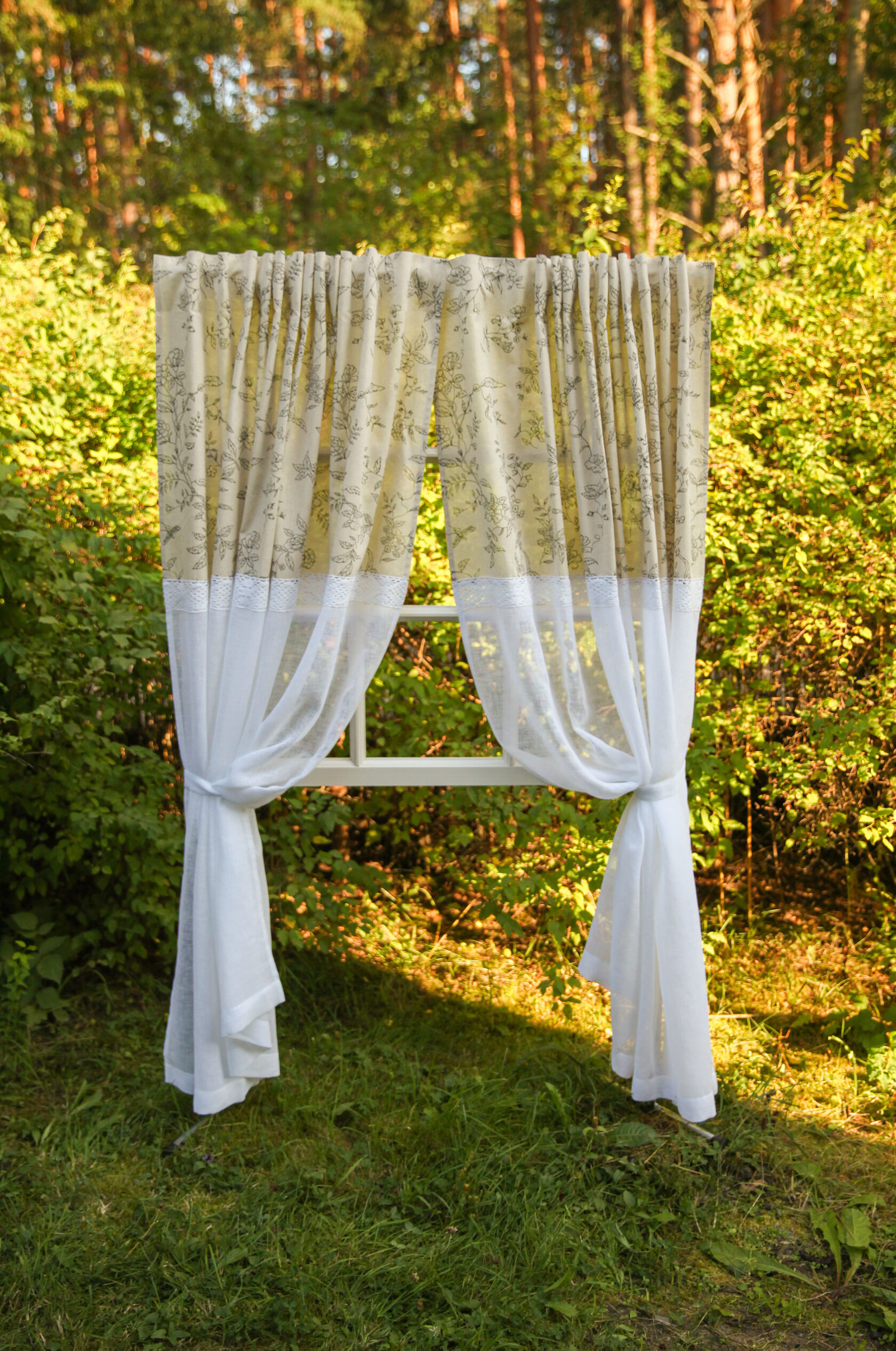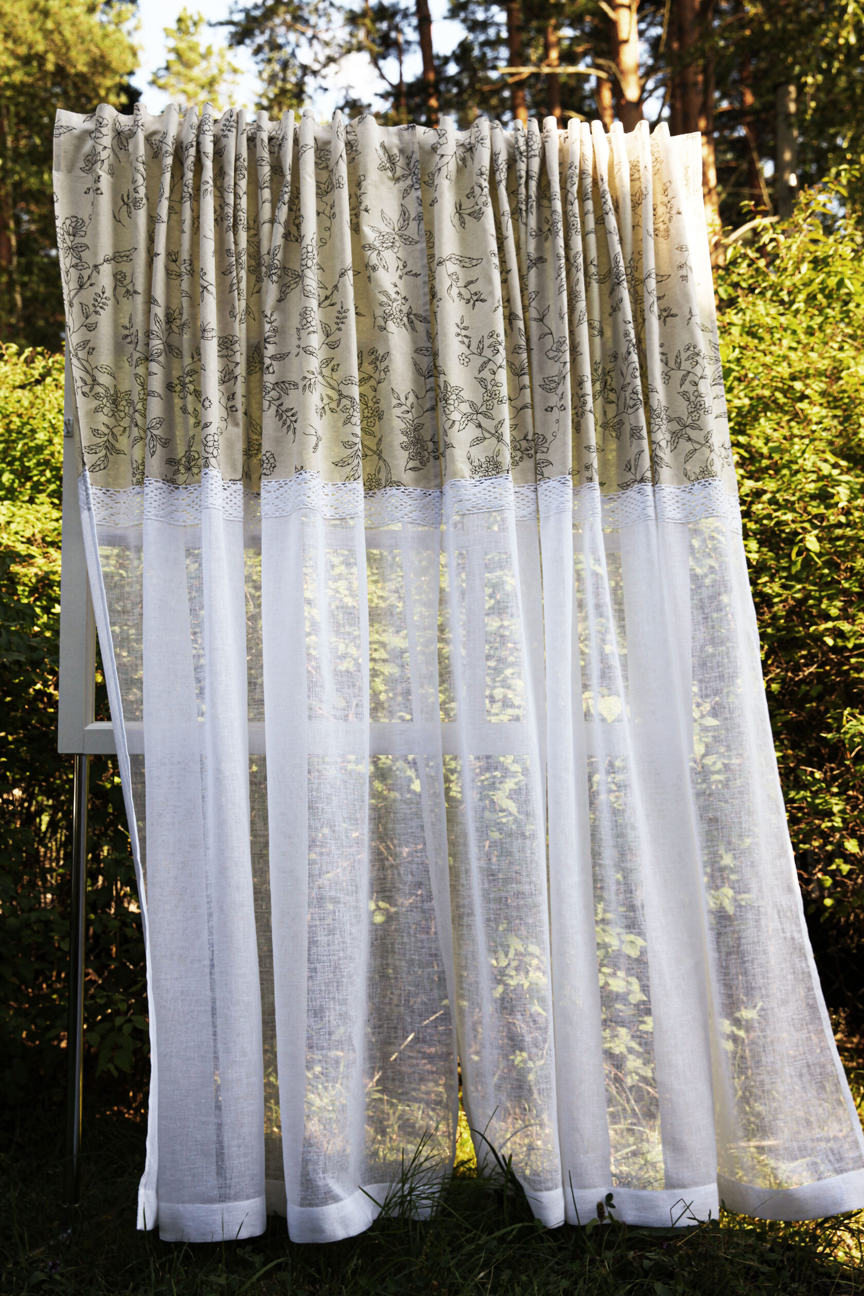 Комплект штор "Эдем" из двух видов ткани, полулен и вуаль - имитация льна с хлопковым кружевом.Ткань дышит,хорошо пропускает воздух,рассеивает прямой свет.Льняные шторы не перегружают пространство и смотрятся воздушно и нежно. Индивидуальная подгонка -под заказ.Изменение размеров и верха изделия под ваш карниз(шторная лента 6 см,кулиса или на петлях) Верх обработан шторной лентой- имитация люверсов, ширина 10 см. Размеры: