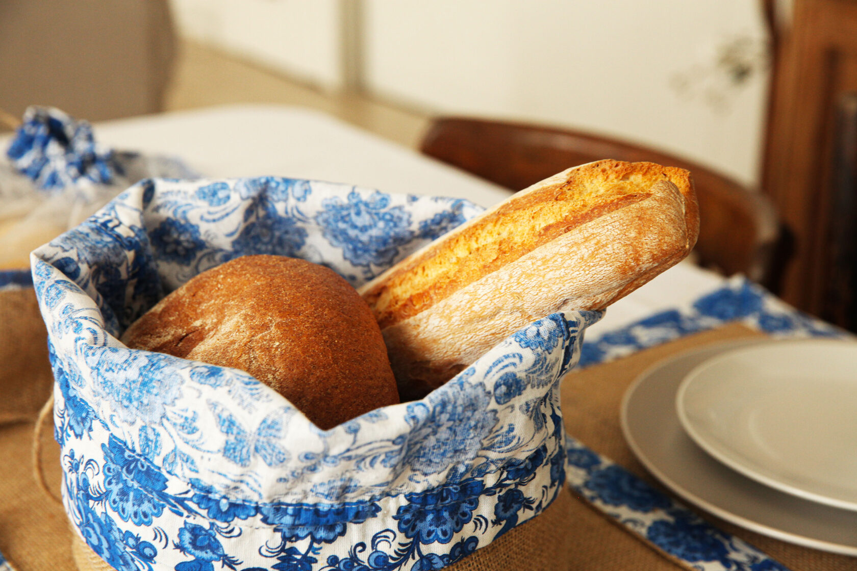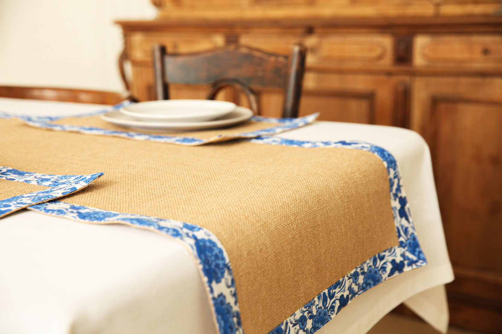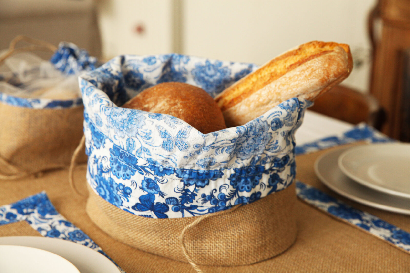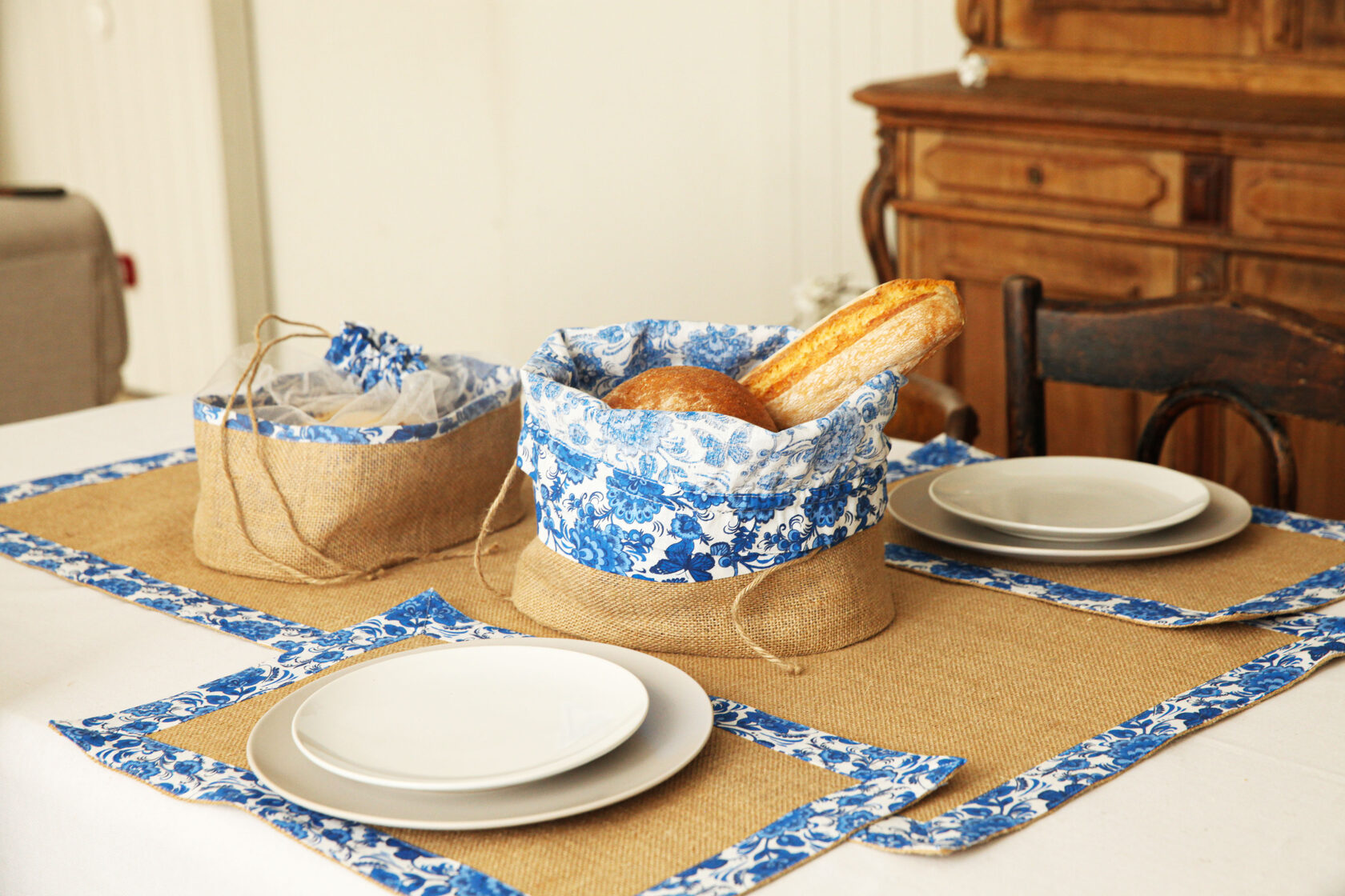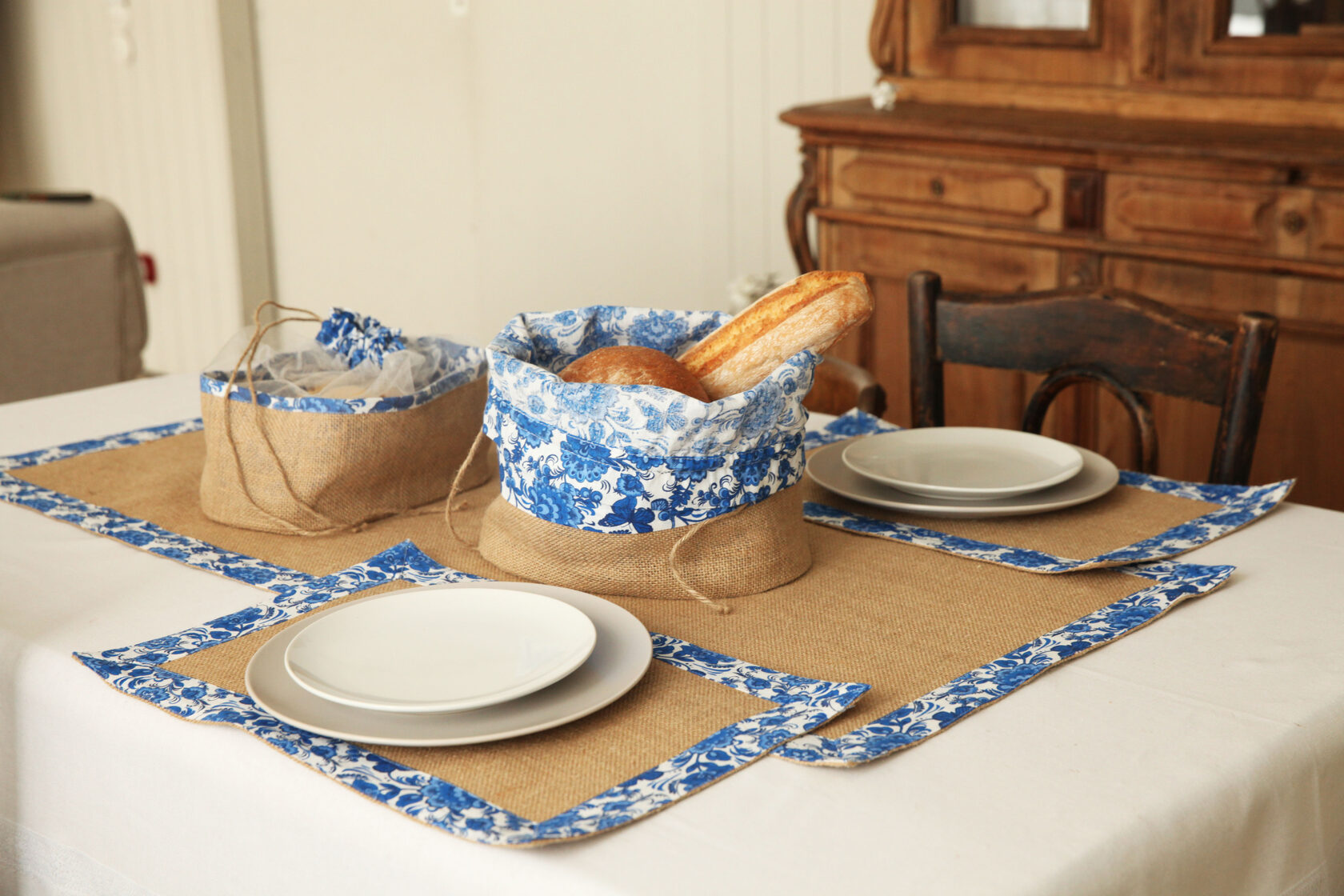 В комплект входит 1шт - столовая дорожка размером 100х45 см,2шт-салфетки 45х30 см и 2 корзинки под продукты.Весь комплект обработан 100% хб тканью,с рисунком"гжель".Идеально подходит для выезда на природу на пикник.