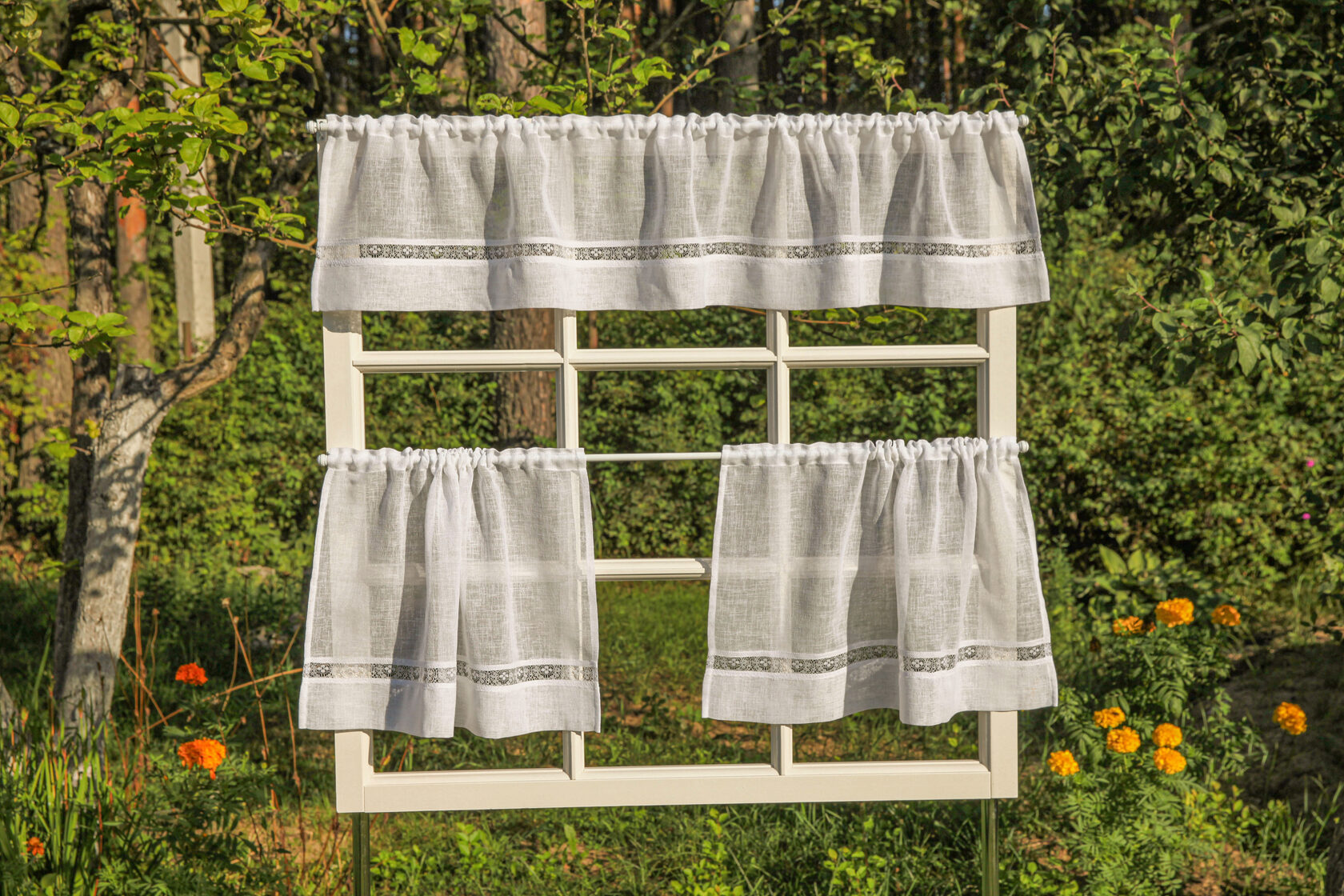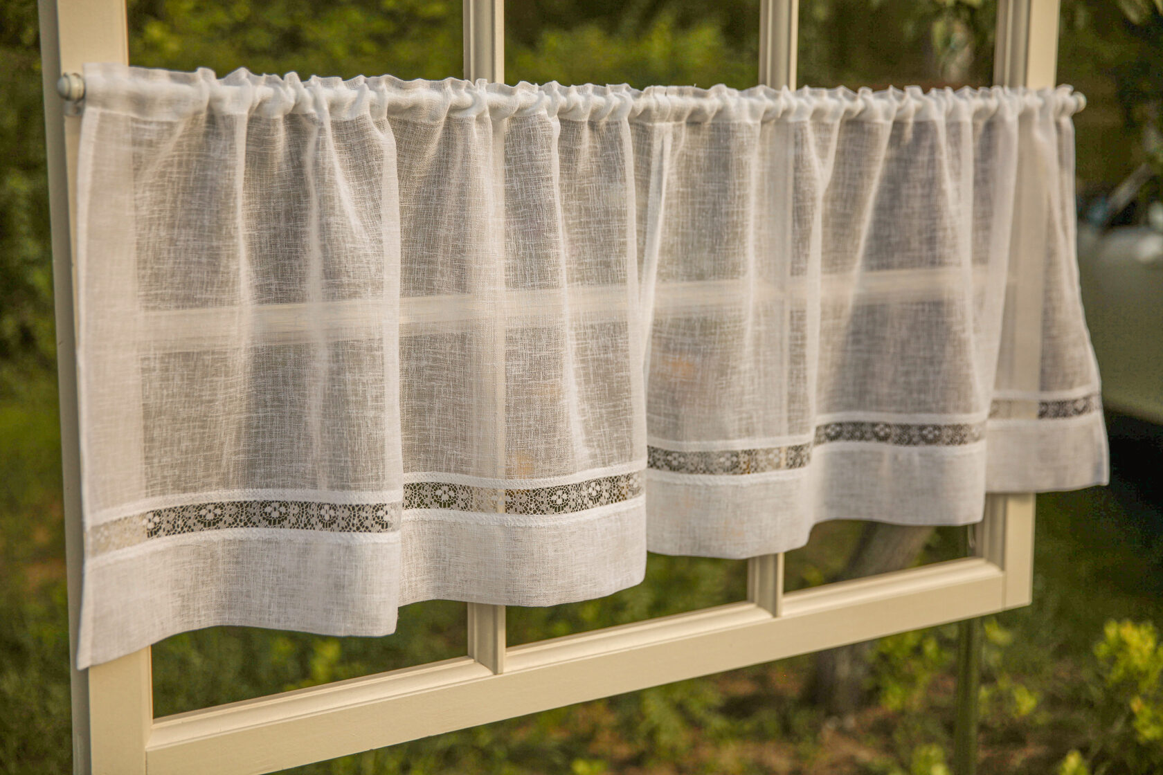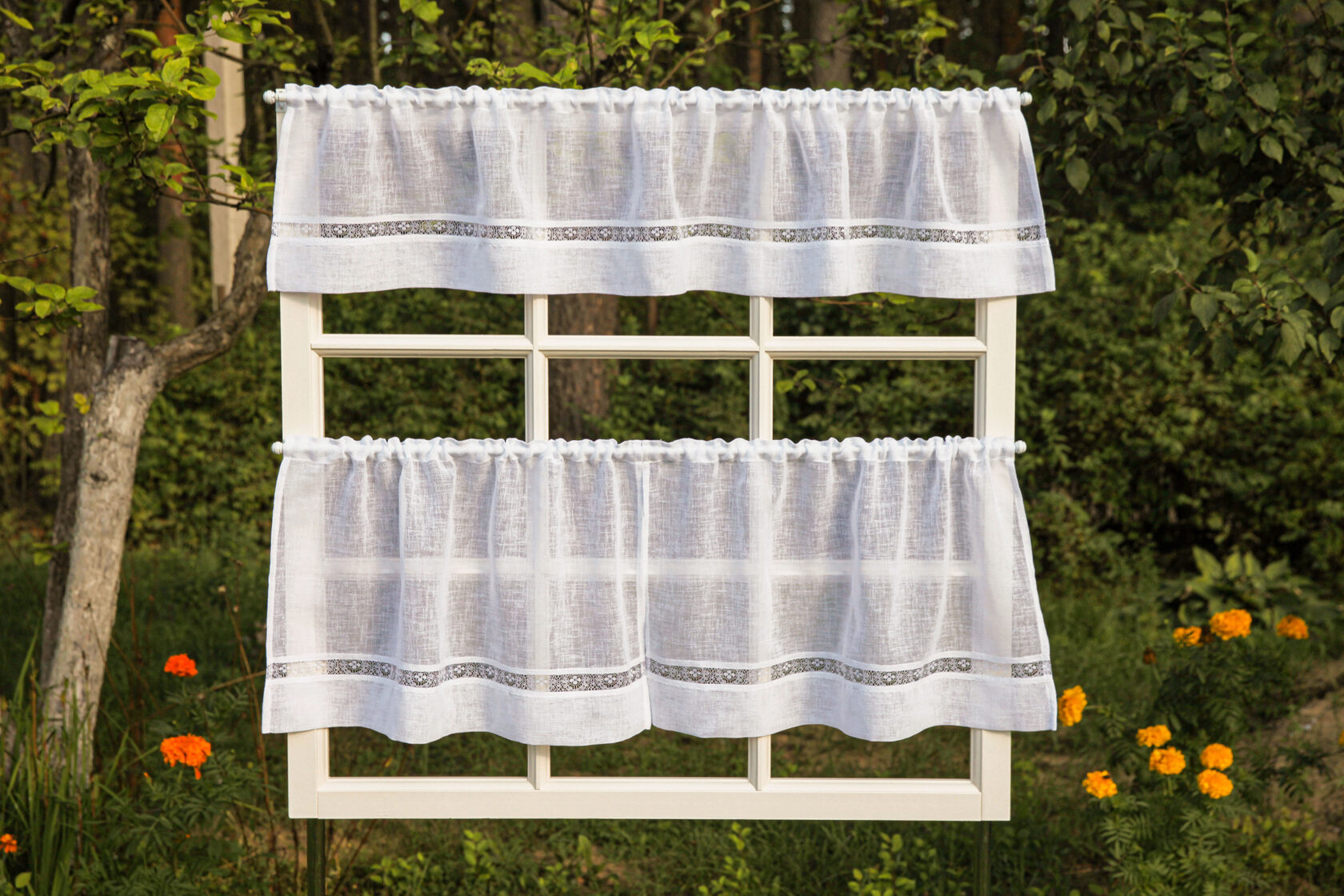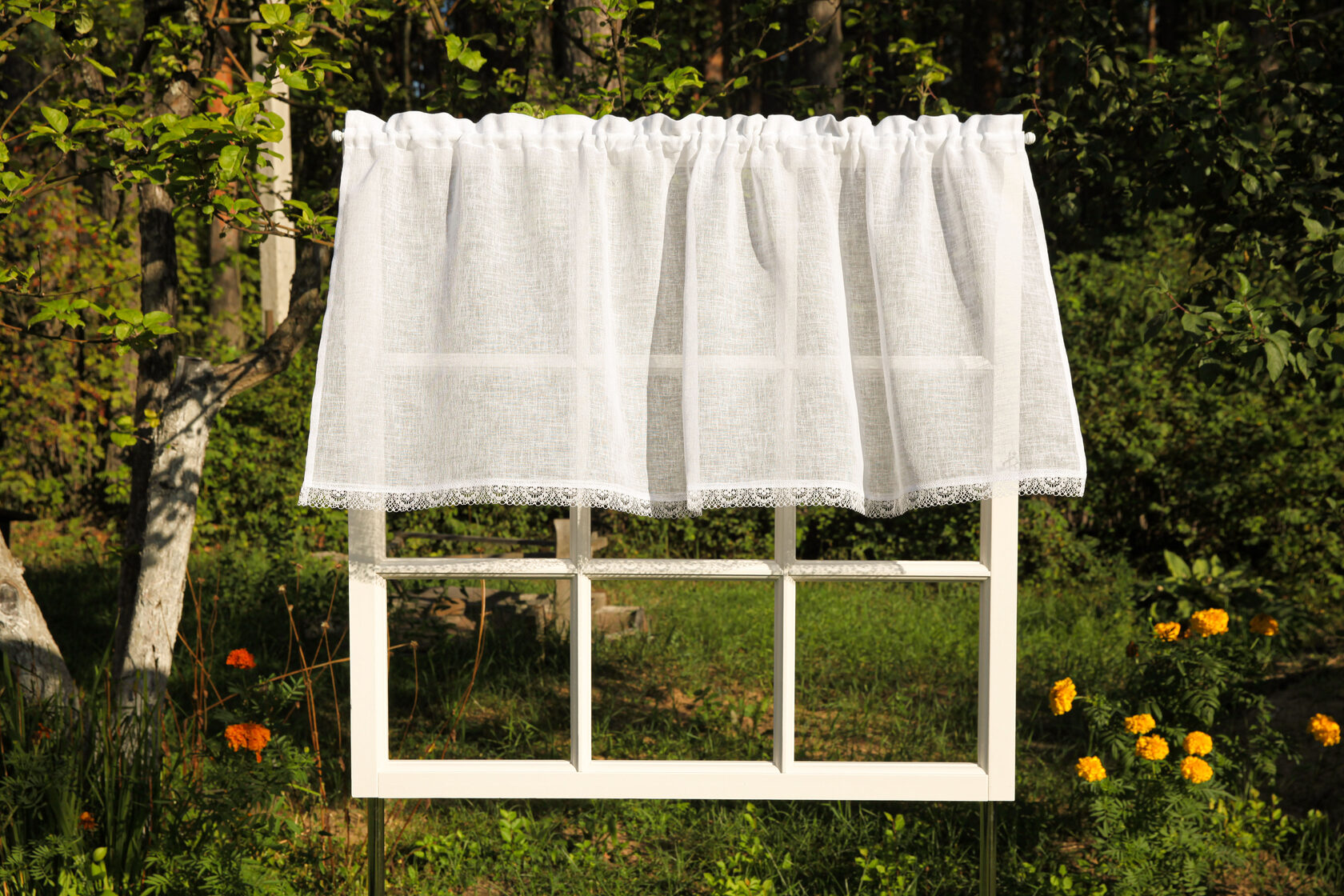 Прозрачные и легкие шторки-кафе из белого вуаля-имитация льна 2 шт.Низ штор украшен нежным кружевом.После стирки не даёт усадку и быстро сохнет.Можно вешать как ламбрекен на верхний карниз,или вниз как шторки -кафе.Мягко фильтруют дневной свет и прибавляют легкости вашей кухне. Индивидуальная подгонка -под заказ.Изменение размеров и верха изделия по ваш карниз(шторная лента 6 см,лента -имитация люверсов 10 см или на петлях) Размеры: шторки-кафе на кулисе 3.5 см ,с гребешком 2.5 см